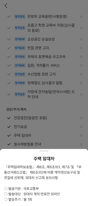 알림수단으로 알려진 대부분의 사이트에서 전체메뉴에서 국민비서를 선택하거나 검색 그리고 나서 알림서비스로 '주택임대차' 선택 신청완료하면 된다.(아래는 카카오서비스의 예시임)