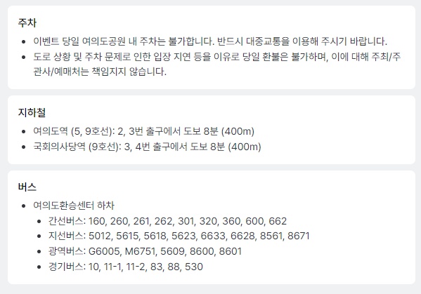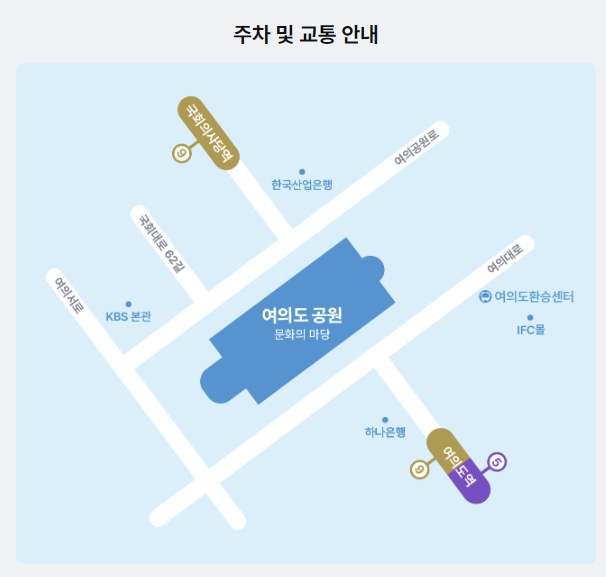 - 주차 및 교통: 주차는 되도록 대중교통 이용바람 / 지하철 5호.9호선 여의도역 2,3번 출구 도보 8분