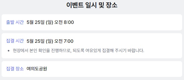 - 집결 시간: 오전 7시/ 현장에서 본인 확인을 하므로 되도록 여유있게 집결