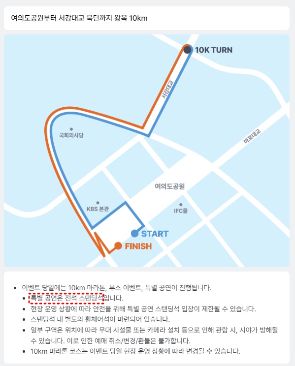 - 코스 :여의도공원 부터 서강대교~북단까지 왕복 10km
