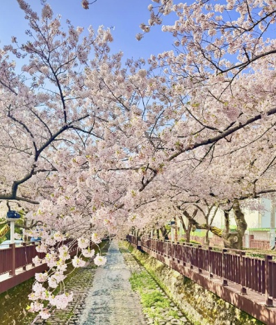 - 여좌천 로망스다리 – 하천 위 벚꽃이 쏟아지는 풍경